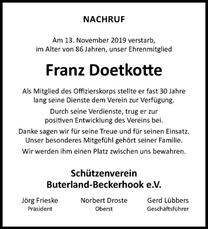 Hier finden Sie alle Traueranzeigen aus der Zeitung, die bisher für Franz Doetkotte erschienen sind. Weitere Traueranzeigen, die in der Zeitung erscheinen, werden hier ebenfalls aufgelistet