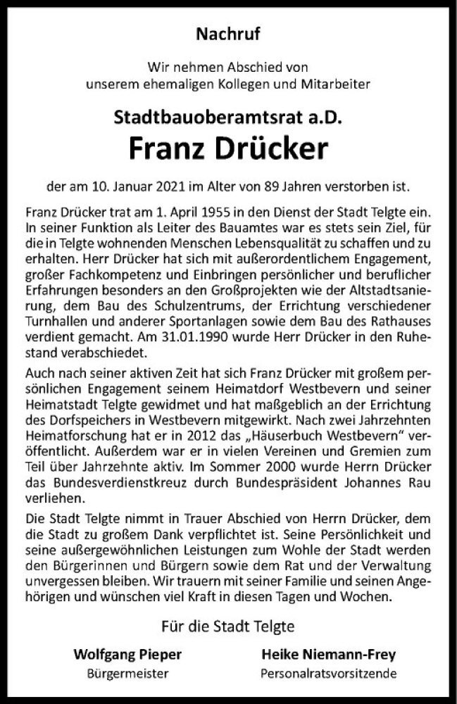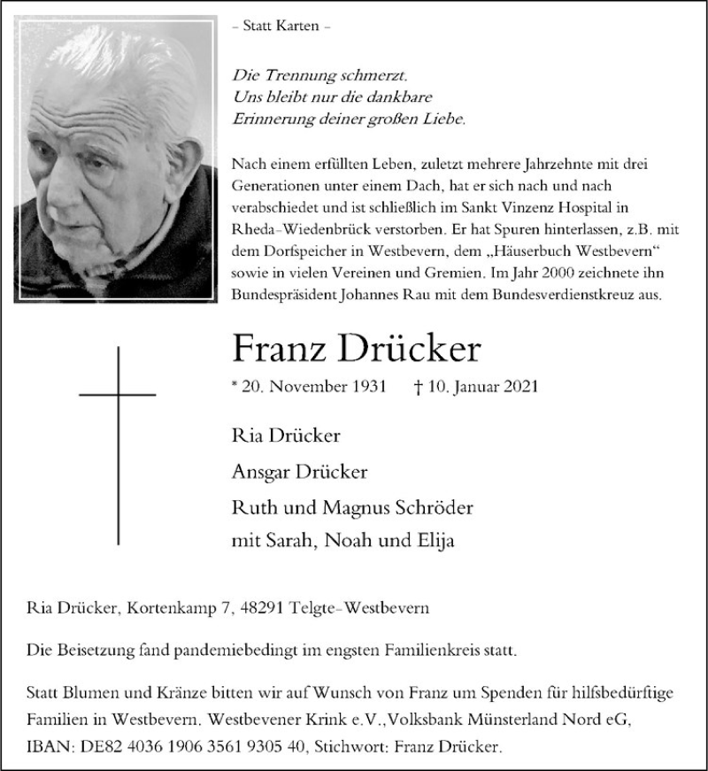 Hier finden Sie alle Traueranzeigen aus der Zeitung, die bisher für Franz Drücker erschienen sind. Weitere Traueranzeigen, die in der Zeitung erscheinen, werden hier ebenfalls aufgelistet
