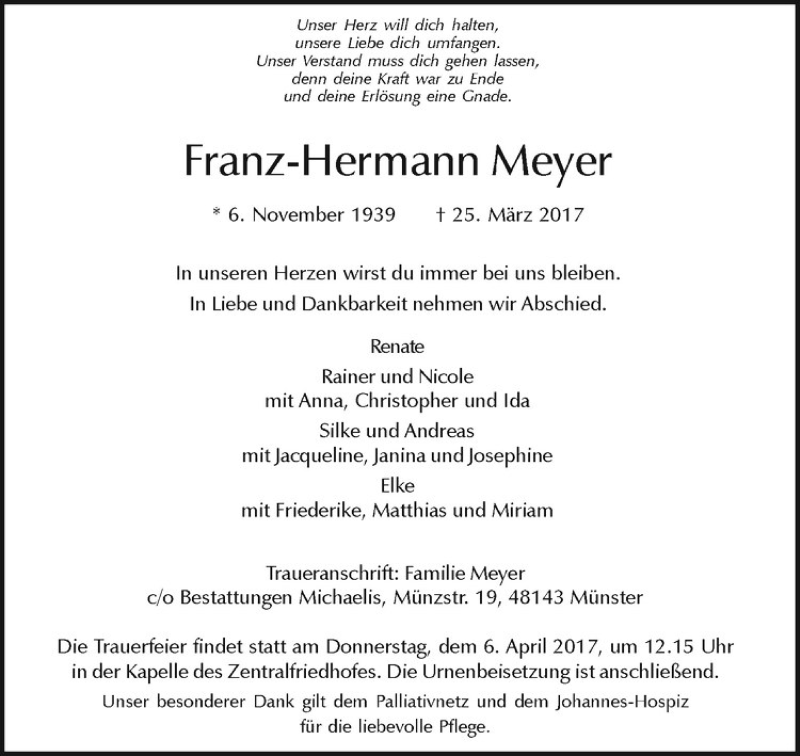 Hier finden Sie alle Traueranzeigen aus der Zeitung, die bisher für Franz-Hermann Meyer erschienen sind. Weitere Traueranzeigen, die in der Zeitung erscheinen, werden hier ebenfalls aufgelistet