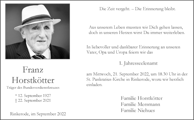 Hier finden Sie alle Traueranzeigen aus der Zeitung, die bisher für Franz Horstkötter erschienen sind. Weitere Traueranzeigen, die in der Zeitung erscheinen, werden hier ebenfalls aufgelistet