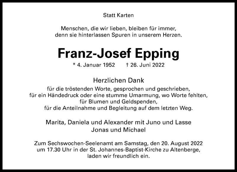 Hier finden Sie alle Traueranzeigen aus der Zeitung, die bisher für Franz-Josef Epping erschienen sind. Weitere Traueranzeigen, die in der Zeitung erscheinen, werden hier ebenfalls aufgelistet