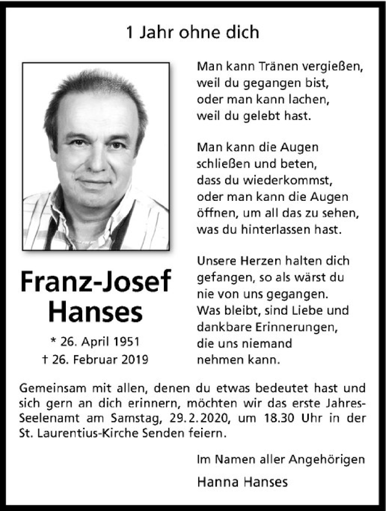 Hier finden Sie alle Traueranzeigen aus der Zeitung, die bisher für Franz-Josef Hanses erschienen sind. Weitere Traueranzeigen, die in der Zeitung erscheinen, werden hier ebenfalls aufgelistet