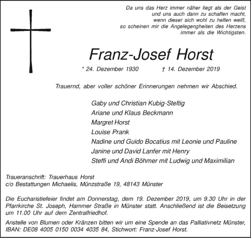 Hier finden Sie alle Traueranzeigen aus der Zeitung, die bisher für Franz-Josef Horst erschienen sind. Weitere Traueranzeigen, die in der Zeitung erscheinen, werden hier ebenfalls aufgelistet