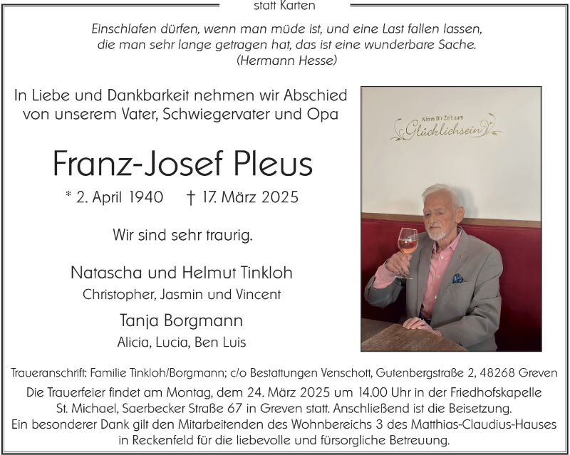 Hier finden Sie alle Traueranzeigen aus der Zeitung, die bisher für Franz-Josef Pleus erschienen sind. Weitere Traueranzeigen, die in der Zeitung erscheinen, werden hier ebenfalls aufgelistet