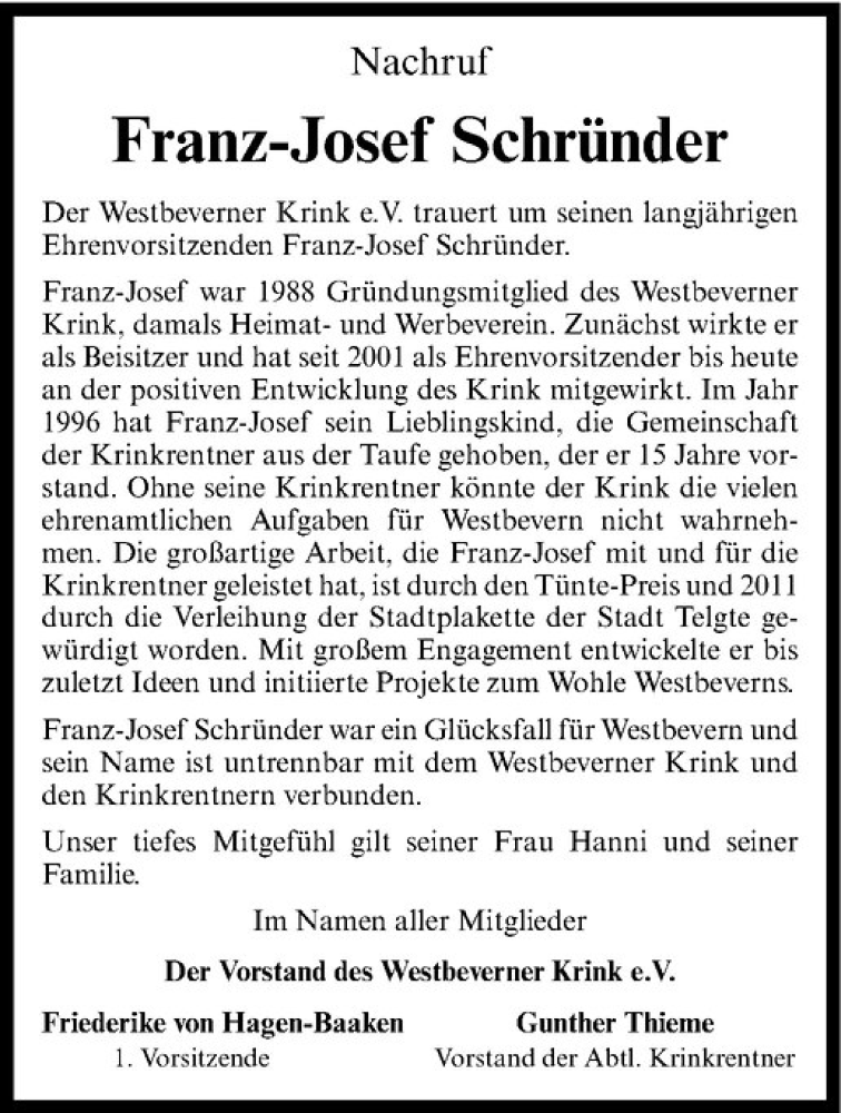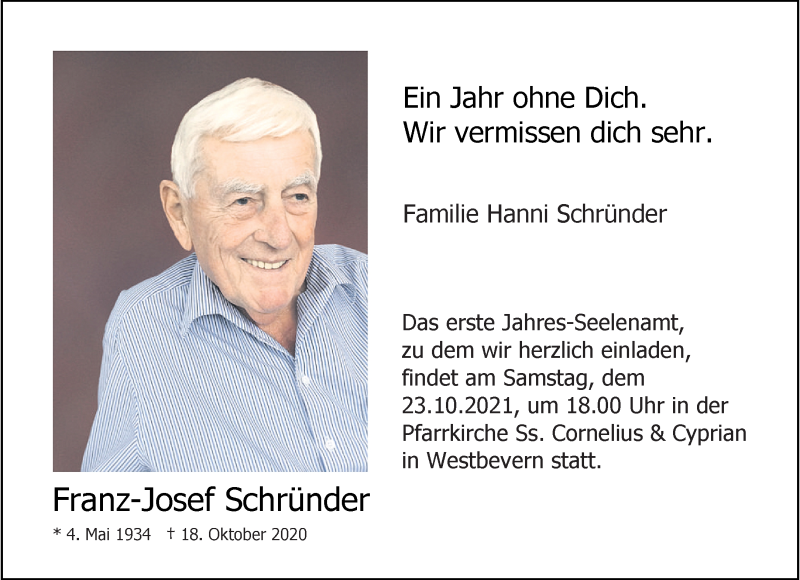 Hier finden Sie alle Traueranzeigen aus der Zeitung, die bisher für Franz-Josef Schründer erschienen sind. Weitere Traueranzeigen, die in der Zeitung erscheinen, werden hier ebenfalls aufgelistet