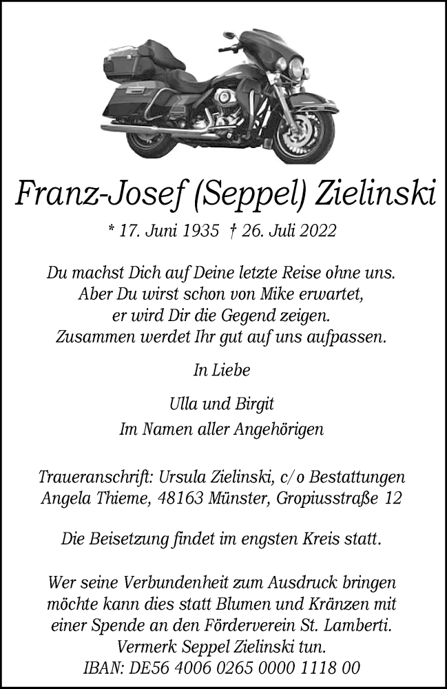 Hier finden Sie alle Traueranzeigen aus der Zeitung, die bisher für Franz-Josef Zielinski erschienen sind. Weitere Traueranzeigen, die in der Zeitung erscheinen, werden hier ebenfalls aufgelistet