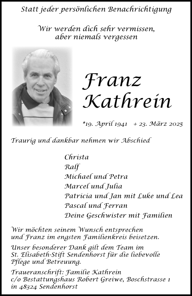 Hier finden Sie alle Traueranzeigen aus der Zeitung, die bisher für Franz Kathrein erschienen sind. Weitere Traueranzeigen, die in der Zeitung erscheinen, werden hier ebenfalls aufgelistet