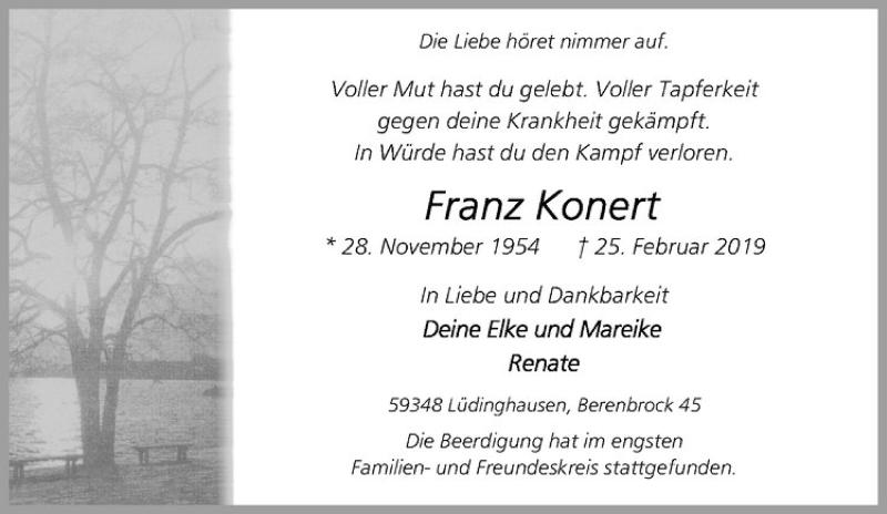 Hier finden Sie alle Traueranzeigen aus der Zeitung, die bisher für Franz Konert erschienen sind. Weitere Traueranzeigen, die in der Zeitung erscheinen, werden hier ebenfalls aufgelistet