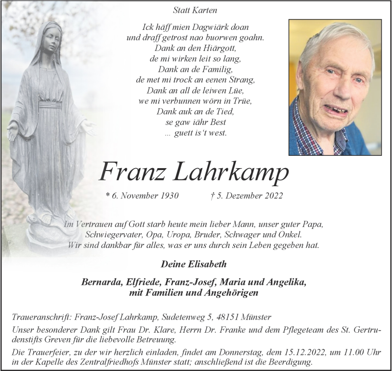Hier finden Sie alle Traueranzeigen aus der Zeitung, die bisher für Franz Lahrkamp erschienen sind. Weitere Traueranzeigen, die in der Zeitung erscheinen, werden hier ebenfalls aufgelistet