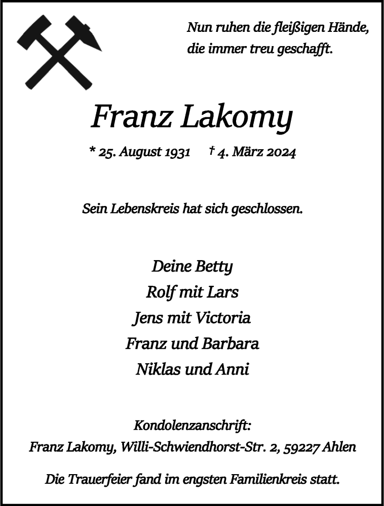 Hier finden Sie alle Traueranzeigen aus der Zeitung, die bisher für Franz Lakomy erschienen sind. Weitere Traueranzeigen, die in der Zeitung erscheinen, werden hier ebenfalls aufgelistet