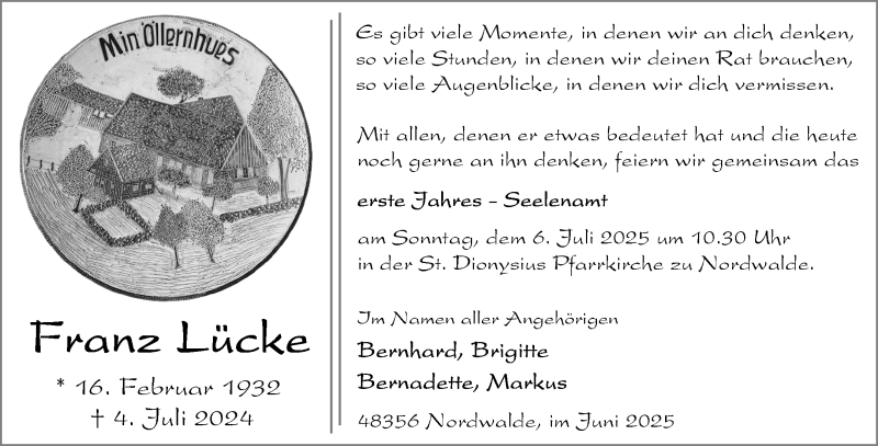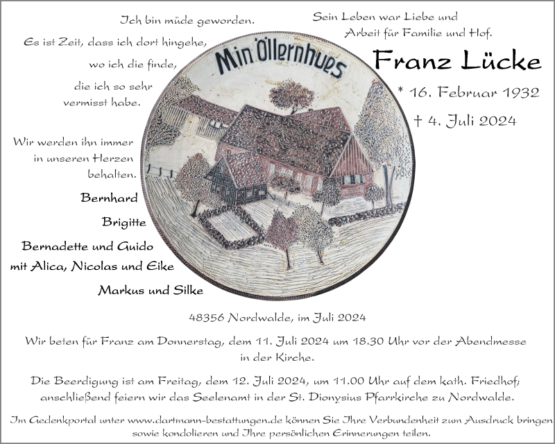 Hier finden Sie alle Traueranzeigen aus der Zeitung, die bisher für Franz Lücke erschienen sind. Weitere Traueranzeigen, die in der Zeitung erscheinen, werden hier ebenfalls aufgelistet