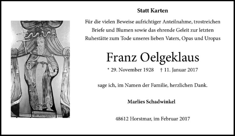Hier finden Sie alle Traueranzeigen aus der Zeitung, die bisher für Franz Oelgeklaus erschienen sind. Weitere Traueranzeigen, die in der Zeitung erscheinen, werden hier ebenfalls aufgelistet