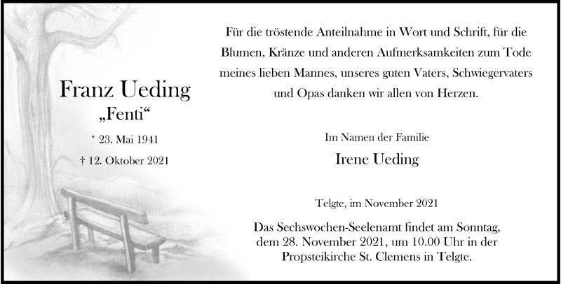 Hier finden Sie alle Traueranzeigen aus der Zeitung, die bisher für Franz Ueding erschienen sind. Weitere Traueranzeigen, die in der Zeitung erscheinen, werden hier ebenfalls aufgelistet