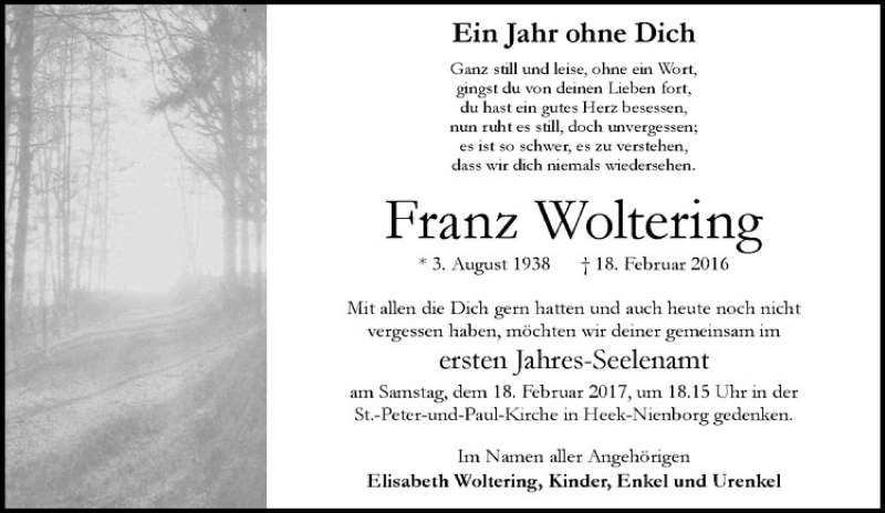 Hier finden Sie alle Traueranzeigen aus der Zeitung, die bisher für Franz Woltering erschienen sind. Weitere Traueranzeigen, die in der Zeitung erscheinen, werden hier ebenfalls aufgelistet