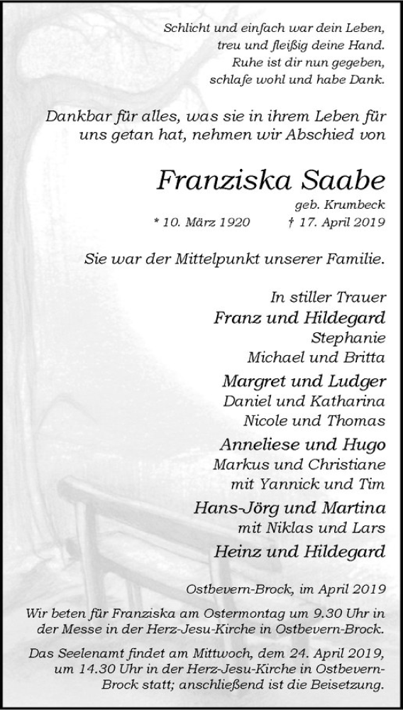 Hier finden Sie alle Traueranzeigen aus der Zeitung, die bisher für Franziska Saabe erschienen sind. Weitere Traueranzeigen, die in der Zeitung erscheinen, werden hier ebenfalls aufgelistet