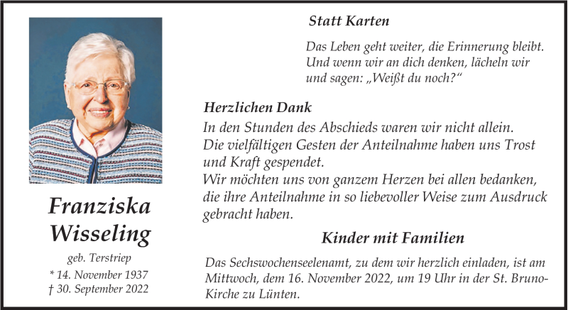 Hier finden Sie alle Traueranzeigen aus der Zeitung, die bisher für Franziska Wisseling erschienen sind. Weitere Traueranzeigen, die in der Zeitung erscheinen, werden hier ebenfalls aufgelistet