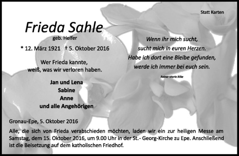 Hier finden Sie alle Traueranzeigen aus der Zeitung, die bisher für Frieda Sahle erschienen sind. Weitere Traueranzeigen, die in der Zeitung erscheinen, werden hier ebenfalls aufgelistet