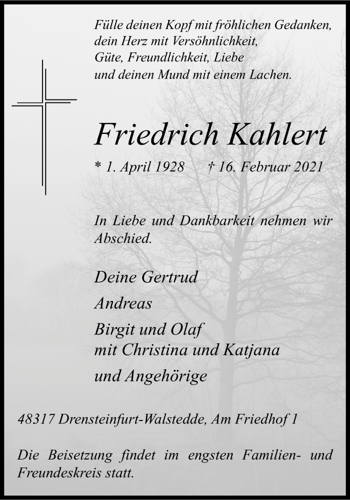 Hier finden Sie alle Traueranzeigen aus der Zeitung, die bisher für Friedrich Kahlert erschienen sind. Weitere Traueranzeigen, die in der Zeitung erscheinen, werden hier ebenfalls aufgelistet