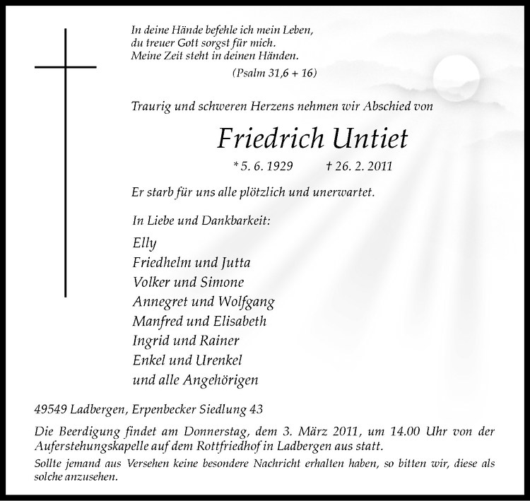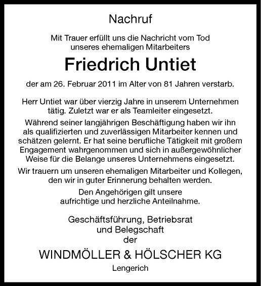 Hier finden Sie alle Traueranzeigen aus der Zeitung, die bisher für Friedrich Untiet erschienen sind. Weitere Traueranzeigen, die in der Zeitung erscheinen, werden hier ebenfalls aufgelistet