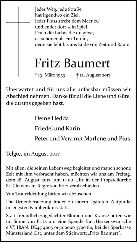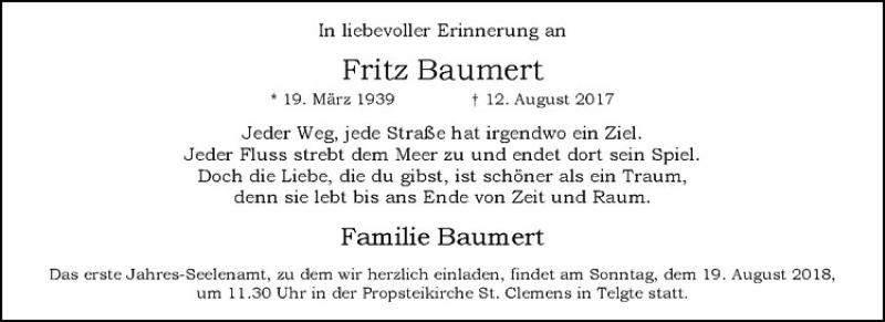 Hier finden Sie alle Traueranzeigen aus der Zeitung, die bisher für Fritz Baumert erschienen sind. Weitere Traueranzeigen, die in der Zeitung erscheinen, werden hier ebenfalls aufgelistet