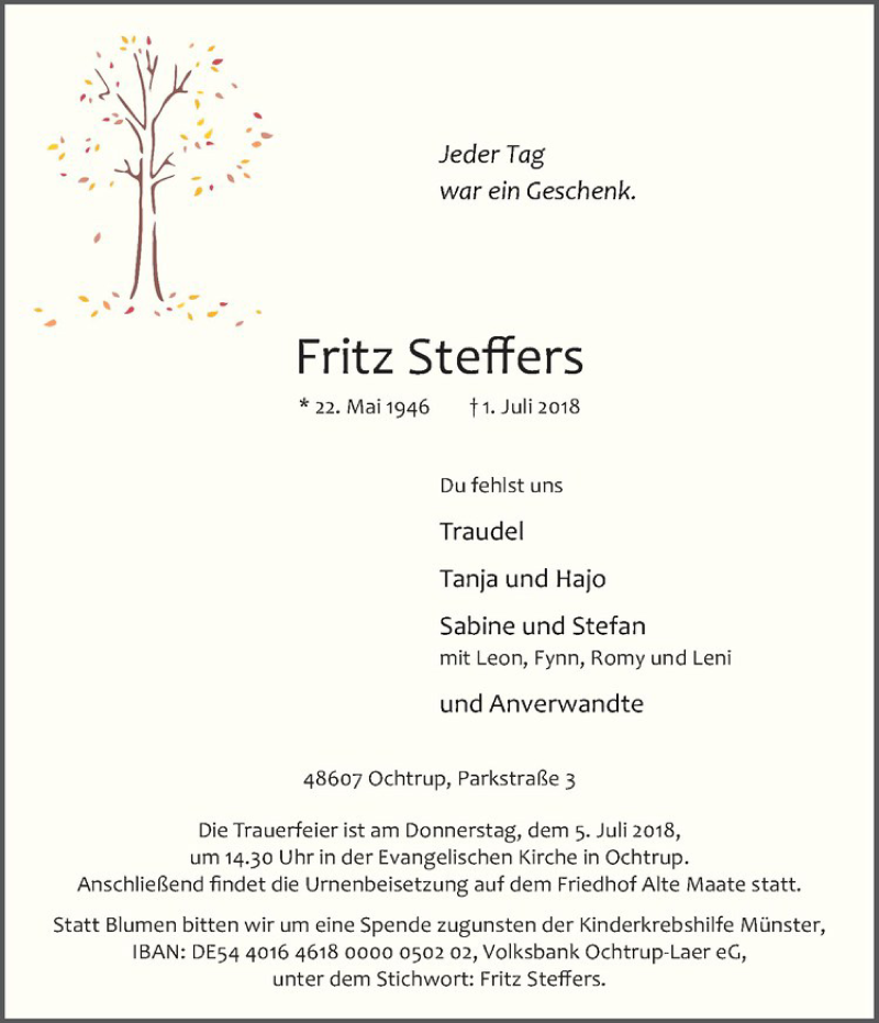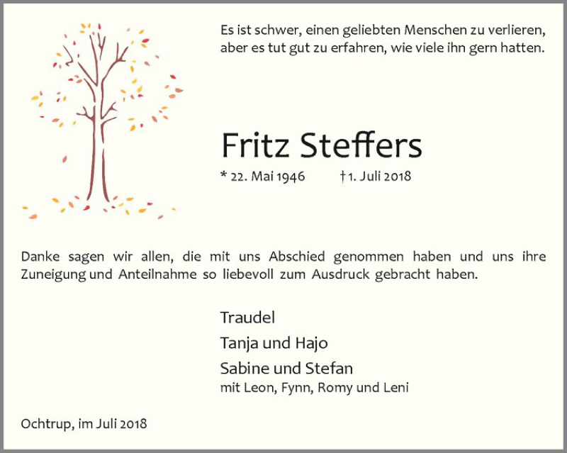 Hier finden Sie alle Traueranzeigen aus der Zeitung, die bisher für Fritz Steffers erschienen sind. Weitere Traueranzeigen, die in der Zeitung erscheinen, werden hier ebenfalls aufgelistet