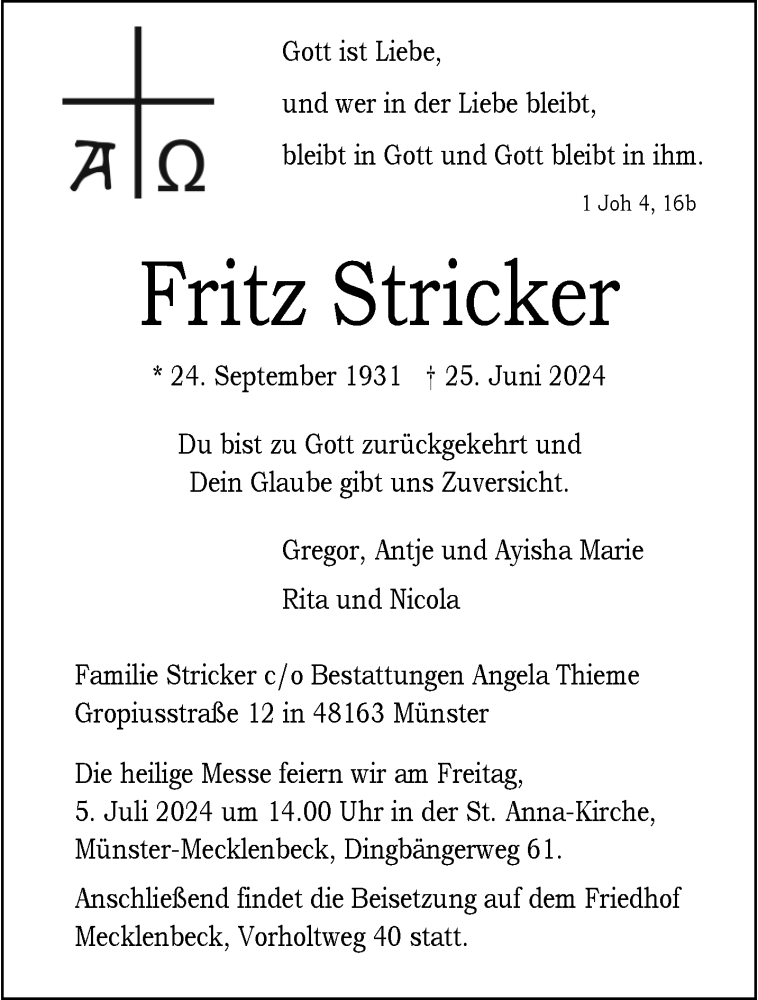 Hier finden Sie alle Traueranzeigen aus der Zeitung, die bisher für Fritz Stricker erschienen sind. Weitere Traueranzeigen, die in der Zeitung erscheinen, werden hier ebenfalls aufgelistet