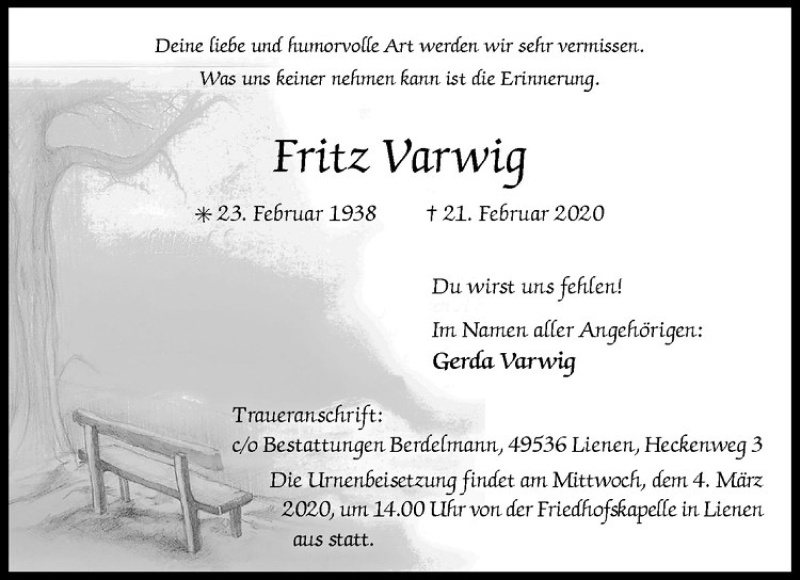 Hier finden Sie alle Traueranzeigen aus der Zeitung, die bisher für Fritz Varwig erschienen sind. Weitere Traueranzeigen, die in der Zeitung erscheinen, werden hier ebenfalls aufgelistet