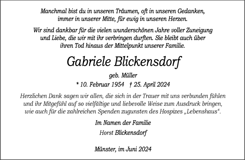 Hier finden Sie alle Traueranzeigen aus der Zeitung, die bisher für Gabriele Blickensdorf erschienen sind. Weitere Traueranzeigen, die in der Zeitung erscheinen, werden hier ebenfalls aufgelistet