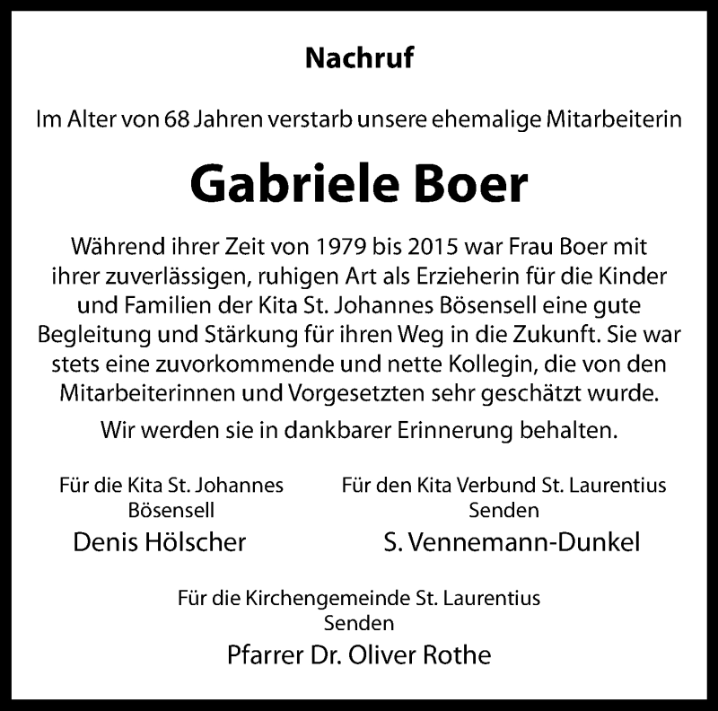 Hier finden Sie alle Traueranzeigen aus der Zeitung, die bisher für Gabriele Boer erschienen sind. Weitere Traueranzeigen, die in der Zeitung erscheinen, werden hier ebenfalls aufgelistet