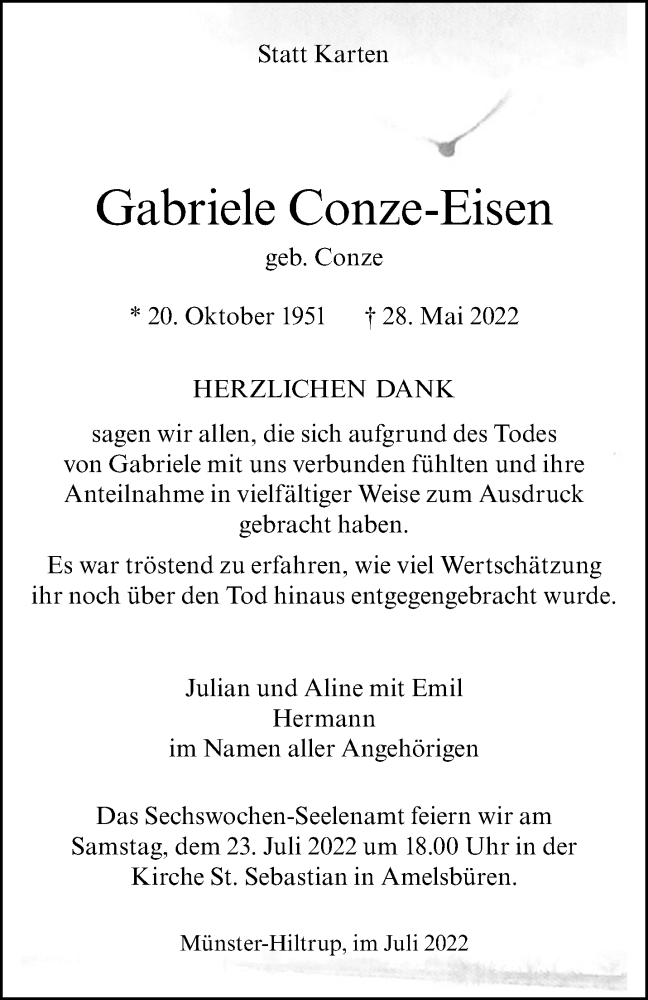 Hier finden Sie alle Traueranzeigen aus der Zeitung, die bisher für Gabriele Conze-Eisen erschienen sind. Weitere Traueranzeigen, die in der Zeitung erscheinen, werden hier ebenfalls aufgelistet