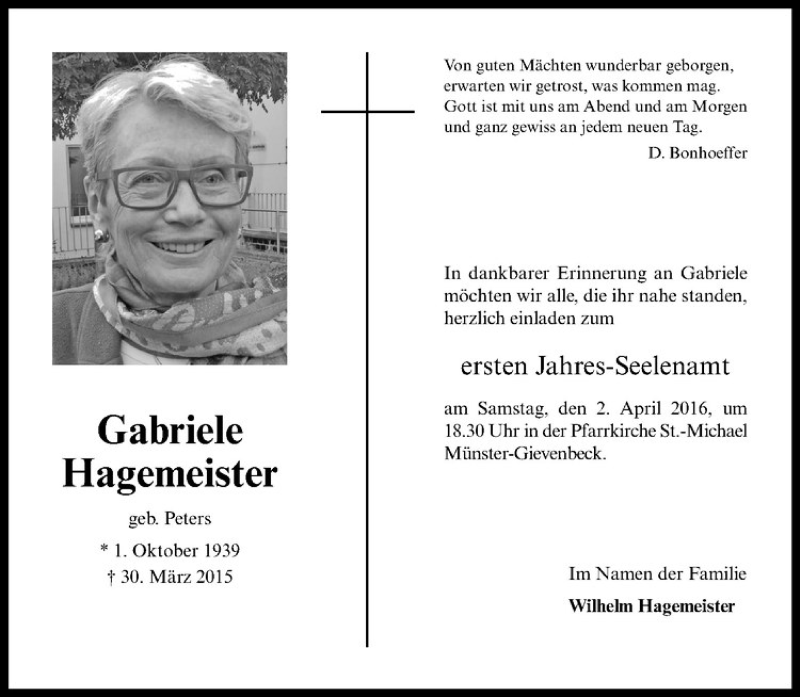 Hier finden Sie alle Traueranzeigen aus der Zeitung, die bisher für Gabriele Hagemeister erschienen sind. Weitere Traueranzeigen, die in der Zeitung erscheinen, werden hier ebenfalls aufgelistet
