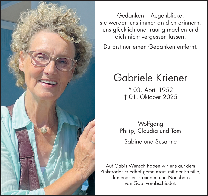 Hier finden Sie alle Traueranzeigen aus der Zeitung, die bisher für Gabriele Kriener erschienen sind. Weitere Traueranzeigen, die in der Zeitung erscheinen, werden hier ebenfalls aufgelistet