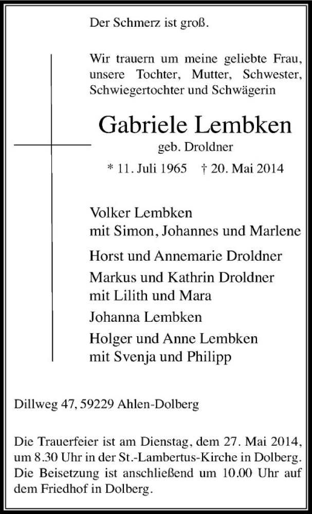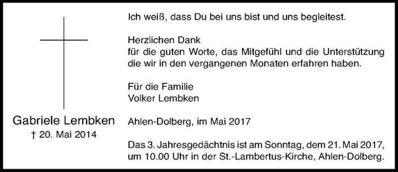 Hier finden Sie alle Traueranzeigen aus der Zeitung, die bisher für Gabriele Lembken erschienen sind. Weitere Traueranzeigen, die in der Zeitung erscheinen, werden hier ebenfalls aufgelistet
