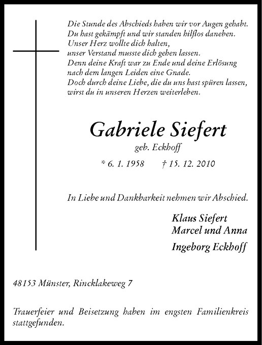 Hier finden Sie alle Traueranzeigen aus der Zeitung, die bisher für Gabriele Siefert erschienen sind. Weitere Traueranzeigen, die in der Zeitung erscheinen, werden hier ebenfalls aufgelistet