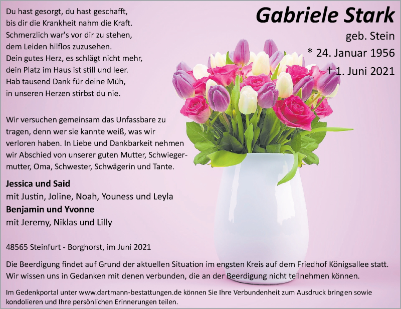 Hier finden Sie alle Traueranzeigen aus der Zeitung, die bisher für Gabriele Stark erschienen sind. Weitere Traueranzeigen, die in der Zeitung erscheinen, werden hier ebenfalls aufgelistet
