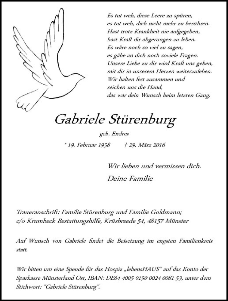 Hier finden Sie alle Traueranzeigen aus der Zeitung, die bisher für Gabriele Stürenburg erschienen sind. Weitere Traueranzeigen, die in der Zeitung erscheinen, werden hier ebenfalls aufgelistet