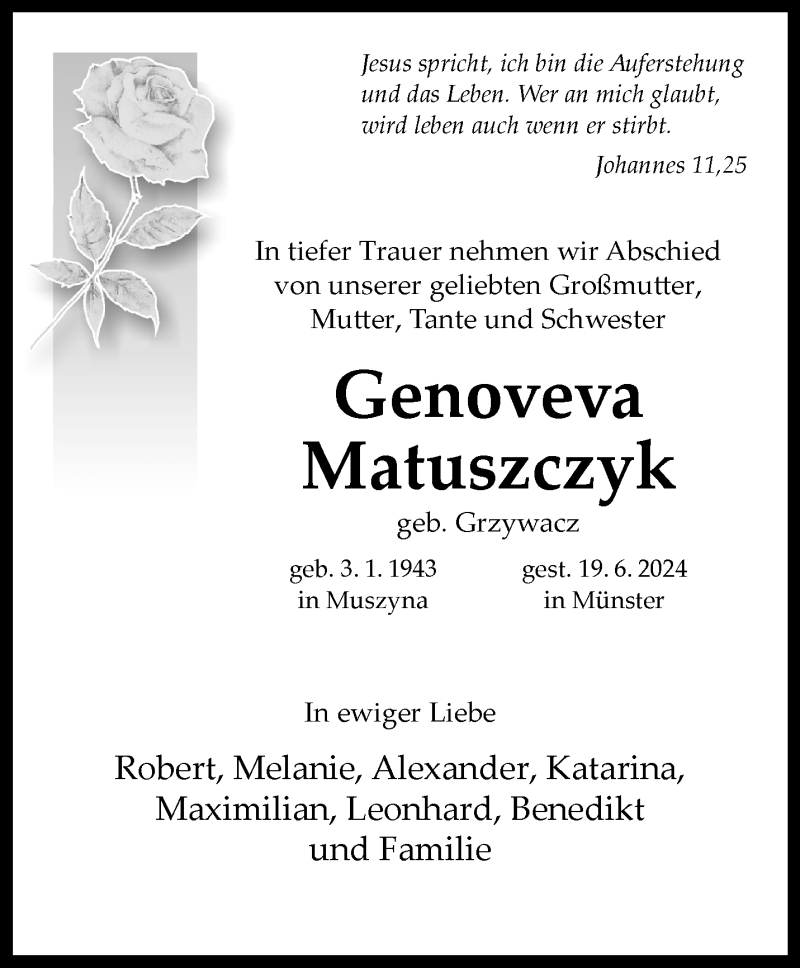 Hier finden Sie alle Traueranzeigen aus der Zeitung, die bisher für Genoveva Matuszczyk erschienen sind. Weitere Traueranzeigen, die in der Zeitung erscheinen, werden hier ebenfalls aufgelistet