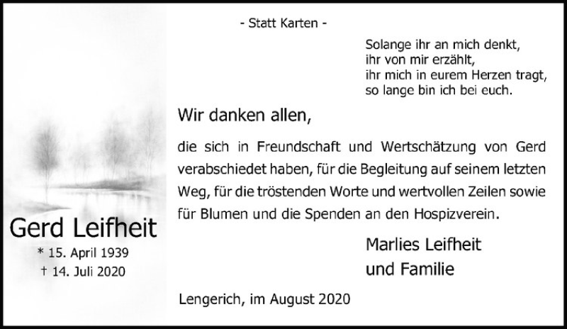Hier finden Sie alle Traueranzeigen aus der Zeitung, die bisher für Gerd Leifheit erschienen sind. Weitere Traueranzeigen, die in der Zeitung erscheinen, werden hier ebenfalls aufgelistet