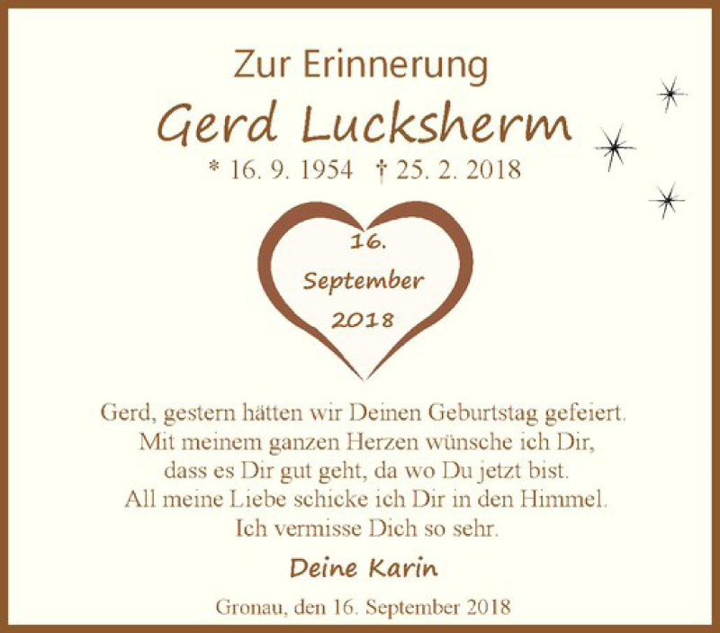 Hier finden Sie alle Traueranzeigen aus der Zeitung, die bisher für Gerd Lucksherm erschienen sind. Weitere Traueranzeigen, die in der Zeitung erscheinen, werden hier ebenfalls aufgelistet