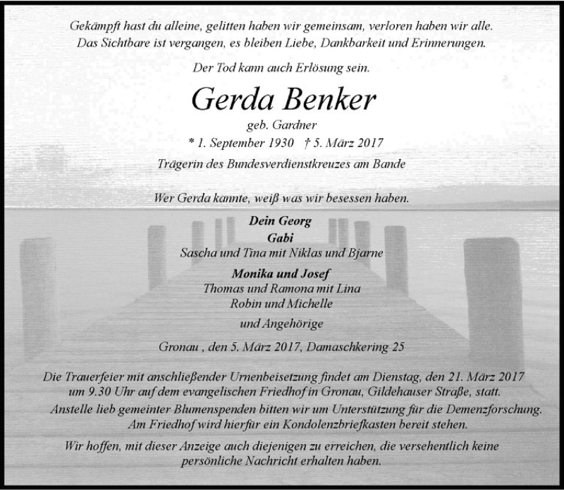 Hier finden Sie alle Traueranzeigen aus der Zeitung, die bisher für Gerda Benker erschienen sind. Weitere Traueranzeigen, die in der Zeitung erscheinen, werden hier ebenfalls aufgelistet