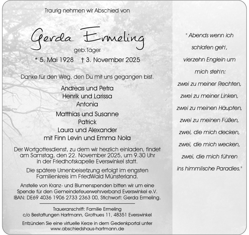 Hier finden Sie alle Traueranzeigen aus der Zeitung, die bisher für Gerda Ermeling erschienen sind. Weitere Traueranzeigen, die in der Zeitung erscheinen, werden hier ebenfalls aufgelistet