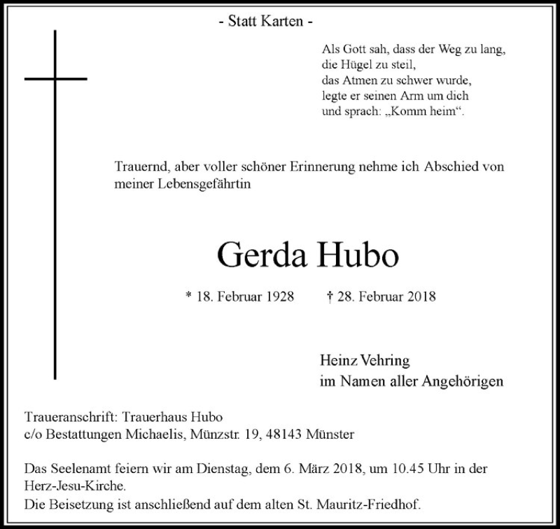 Hier finden Sie alle Traueranzeigen aus der Zeitung, die bisher für Gerda Hubo erschienen sind. Weitere Traueranzeigen, die in der Zeitung erscheinen, werden hier ebenfalls aufgelistet