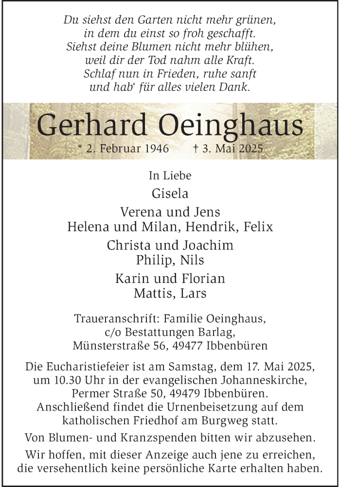 Hier finden Sie alle Traueranzeigen aus der Zeitung, die bisher für Gerhard Oeinghaus erschienen sind. Weitere Traueranzeigen, die in der Zeitung erscheinen, werden hier ebenfalls aufgelistet