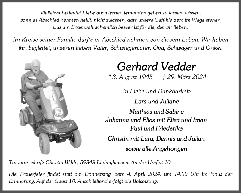 Hier finden Sie alle Traueranzeigen aus der Zeitung, die bisher für Gerhard Vedder erschienen sind. Weitere Traueranzeigen, die in der Zeitung erscheinen, werden hier ebenfalls aufgelistet