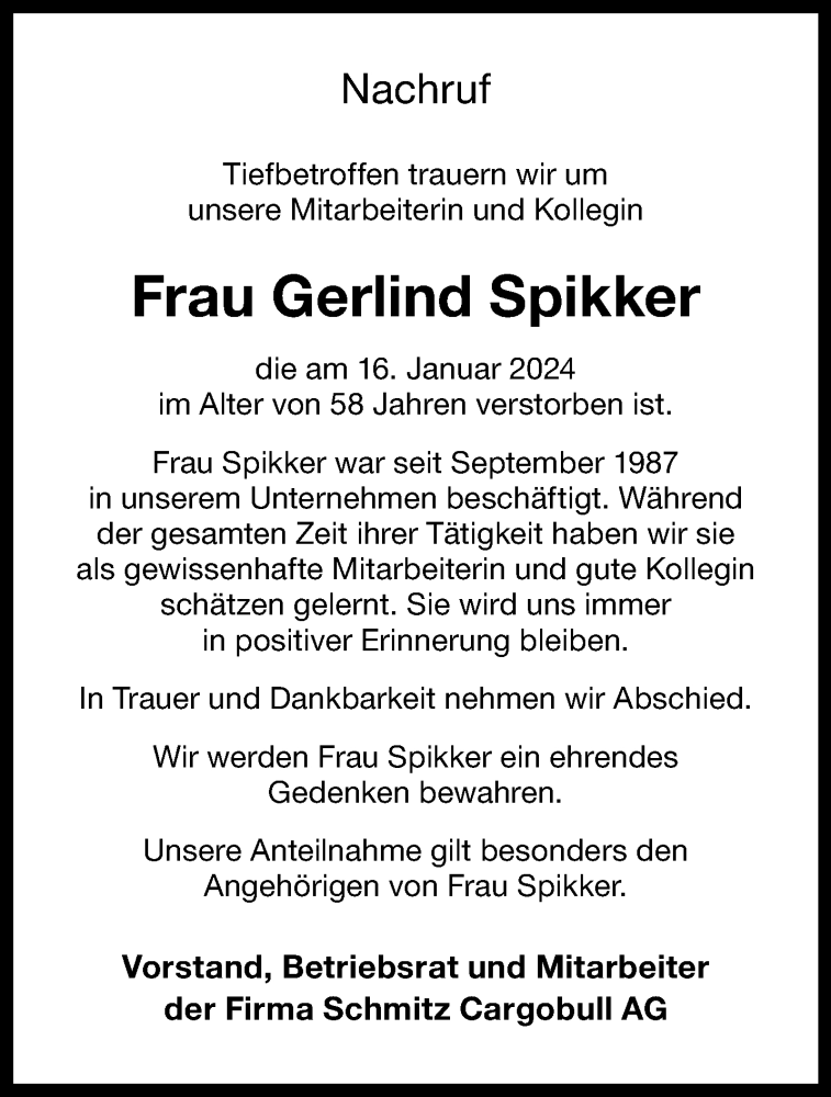Hier finden Sie alle Traueranzeigen aus der Zeitung, die bisher für Gerlind Spikker erschienen sind. Weitere Traueranzeigen, die in der Zeitung erscheinen, werden hier ebenfalls aufgelistet