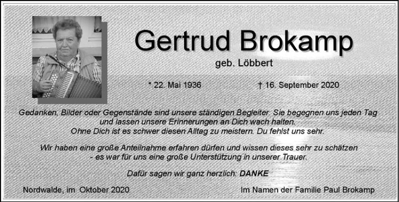 Hier finden Sie alle Traueranzeigen aus der Zeitung, die bisher für Gertrud Brokamp erschienen sind. Weitere Traueranzeigen, die in der Zeitung erscheinen, werden hier ebenfalls aufgelistet