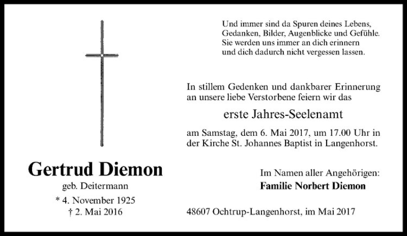 Hier finden Sie alle Traueranzeigen aus der Zeitung, die bisher für Gertrud Diemon erschienen sind. Weitere Traueranzeigen, die in der Zeitung erscheinen, werden hier ebenfalls aufgelistet