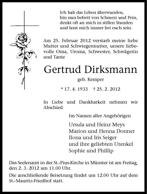 Hier finden Sie alle Traueranzeigen aus der Zeitung, die bisher für Gertrud Dirksmann erschienen sind. Weitere Traueranzeigen, die in der Zeitung erscheinen, werden hier ebenfalls aufgelistet