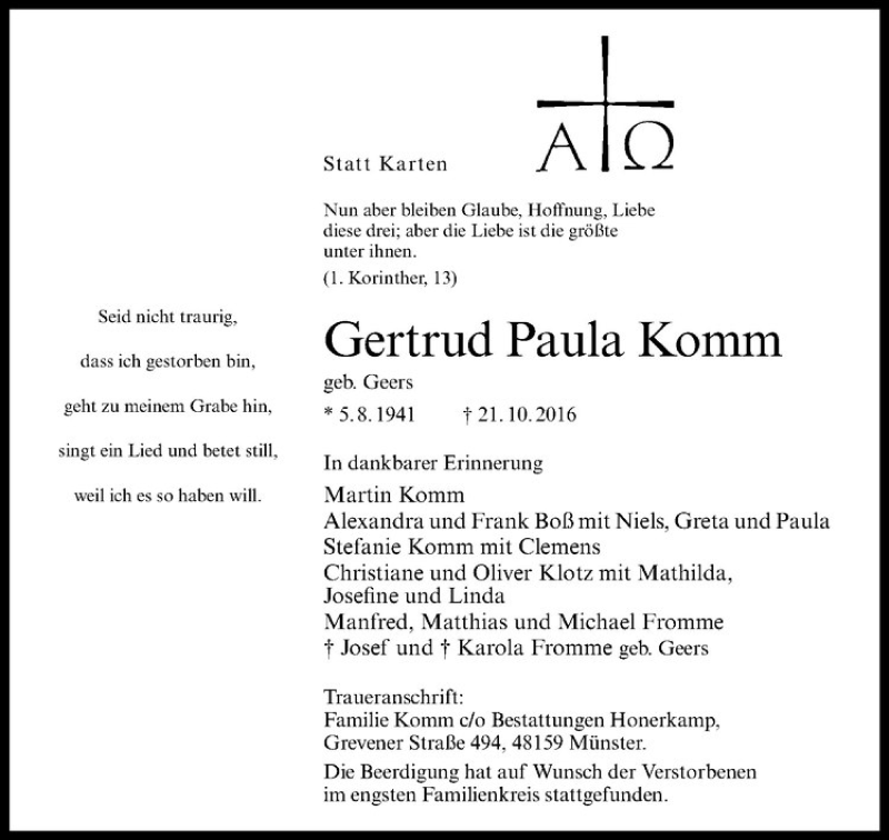 Hier finden Sie alle Traueranzeigen aus der Zeitung, die bisher für Gertrud Paula Komm erschienen sind. Weitere Traueranzeigen, die in der Zeitung erscheinen, werden hier ebenfalls aufgelistet