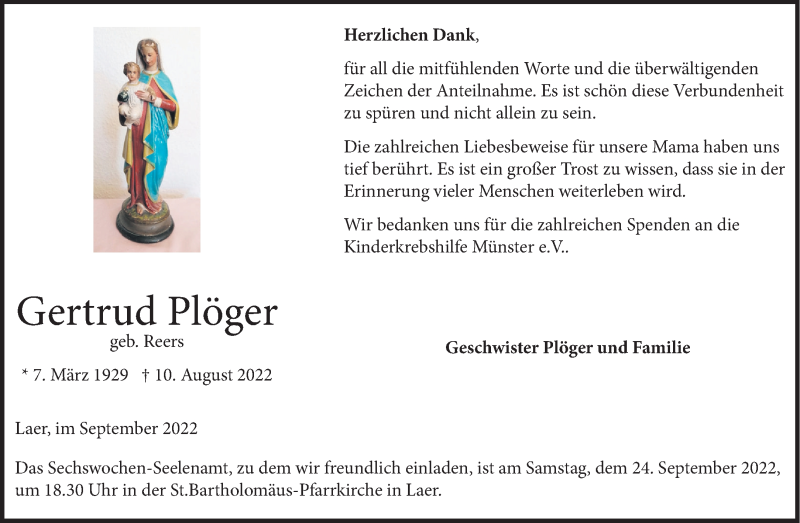 Hier finden Sie alle Traueranzeigen aus der Zeitung, die bisher für Gertrud Plöger erschienen sind. Weitere Traueranzeigen, die in der Zeitung erscheinen, werden hier ebenfalls aufgelistet